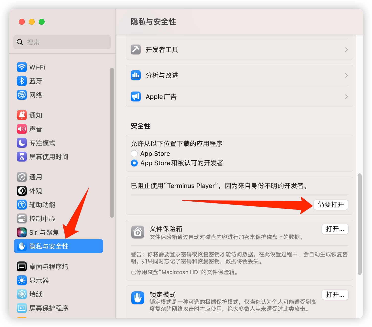 然后来到设置-隐私与安全性-安全性,点击仍要打开,输入电脑密码即可。